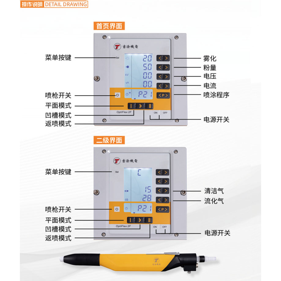 1.optistan2F 靜電噴槍控制器是調(diào)節(jié)所有叁數(shù)的核心,它清晰的液晶顯示屏設(shè)計(jì)幫您找到適用于任何運(yùn)作條件的最佳設(shè)置。確認(rèn)工藝參數(shù),系統(tǒng)參數(shù),工藝數(shù)值。查看狀態(tài),并可調(diào)節(jié)電壓氣量。